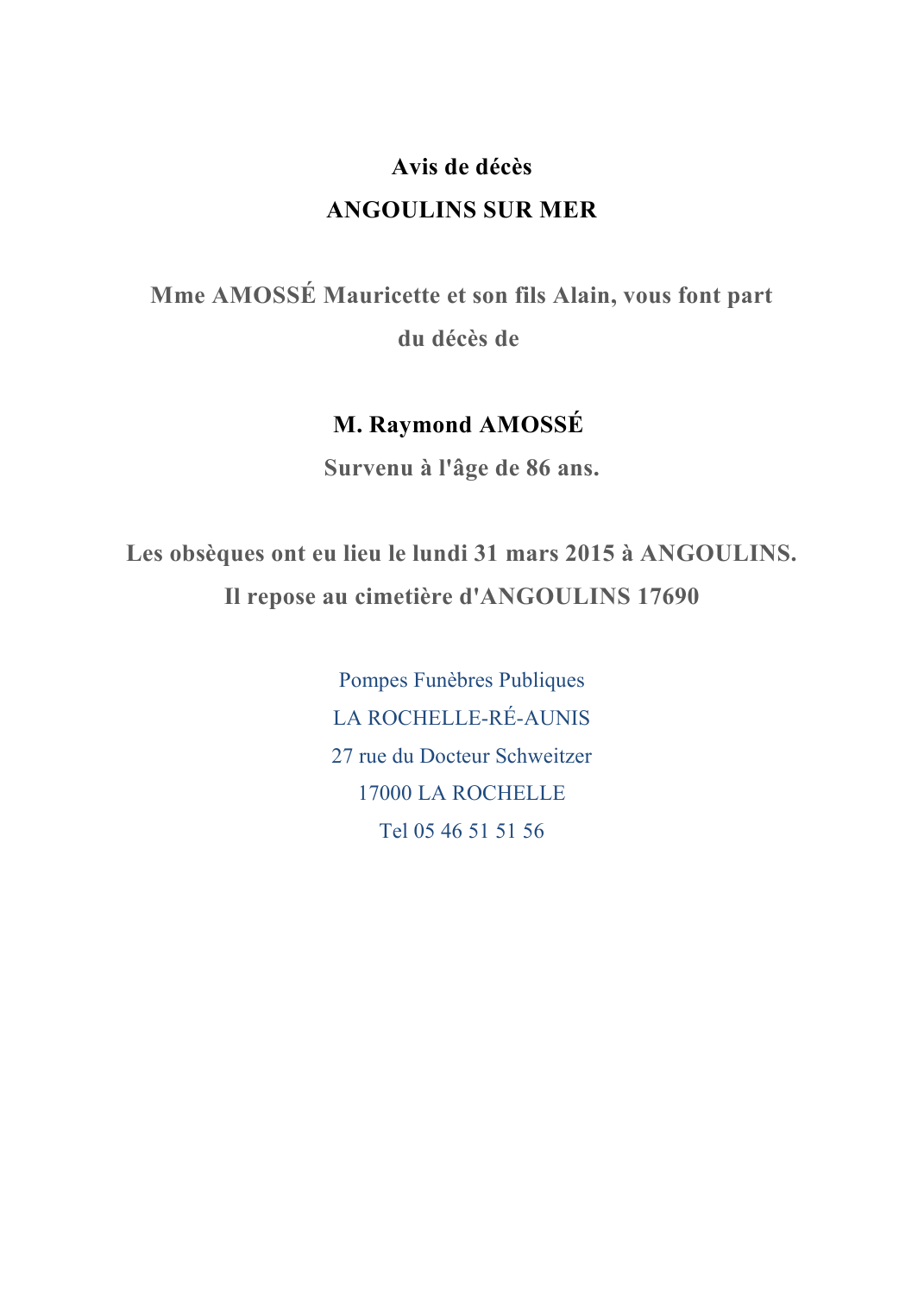 Décédé à Angoulins (17690, France) le lundi 23 mars 2015 à l'âge de 86 ans
