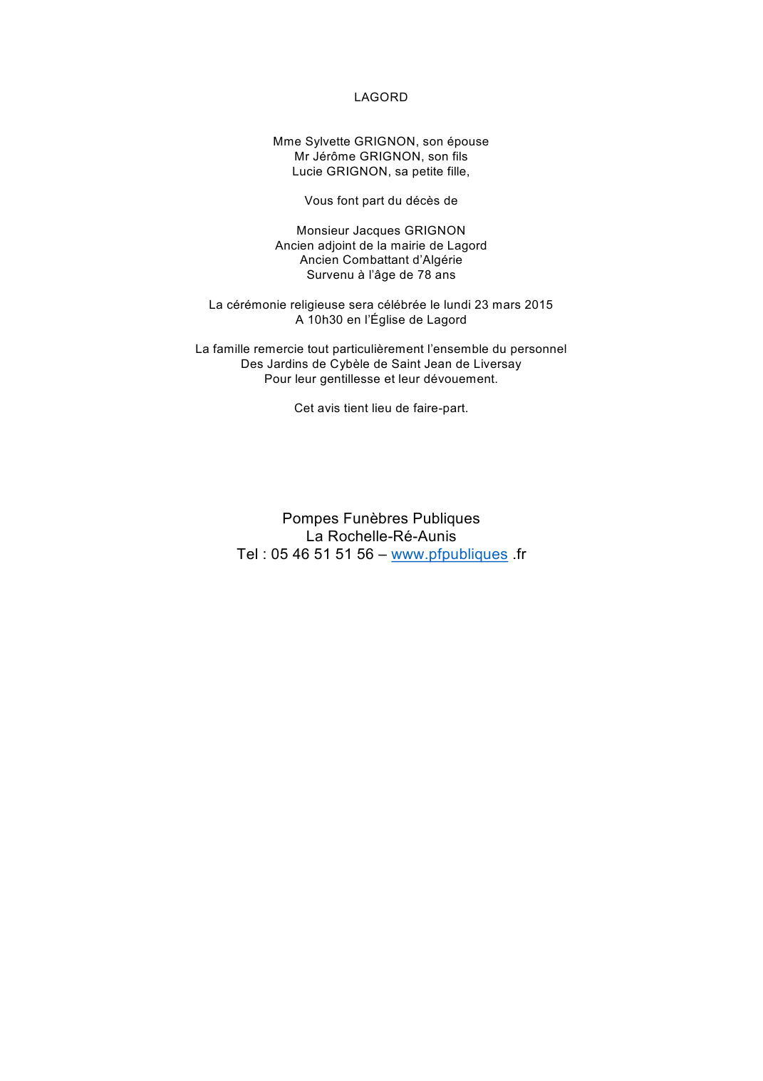 Décédé à Saint-Jean-de-Liversay (17170, France) le dimanche 15 mars 2015 à l'âge de 77 ans