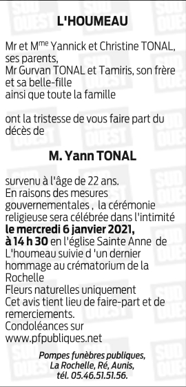 Décédé à La Rochelle (17000, France) le mercredi 30 décembre 2020 à l'âge de 22 ans