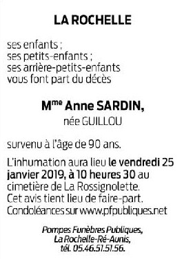 Décédée à La Rochelle (17000, France) le samedi 19 janvier 2019 à l'âge de 90 ans