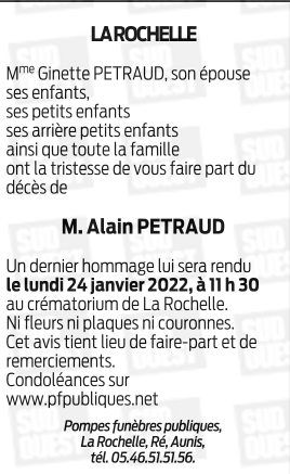 Décédé à La Rochelle (17000, France) le jeudi 13 janvier 2022 à l'âge de 73 ans