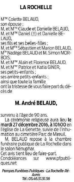 Décédé à Clavette (17220, France) le jeudi 22 décembre 2016 à l'âge de 90 ans
