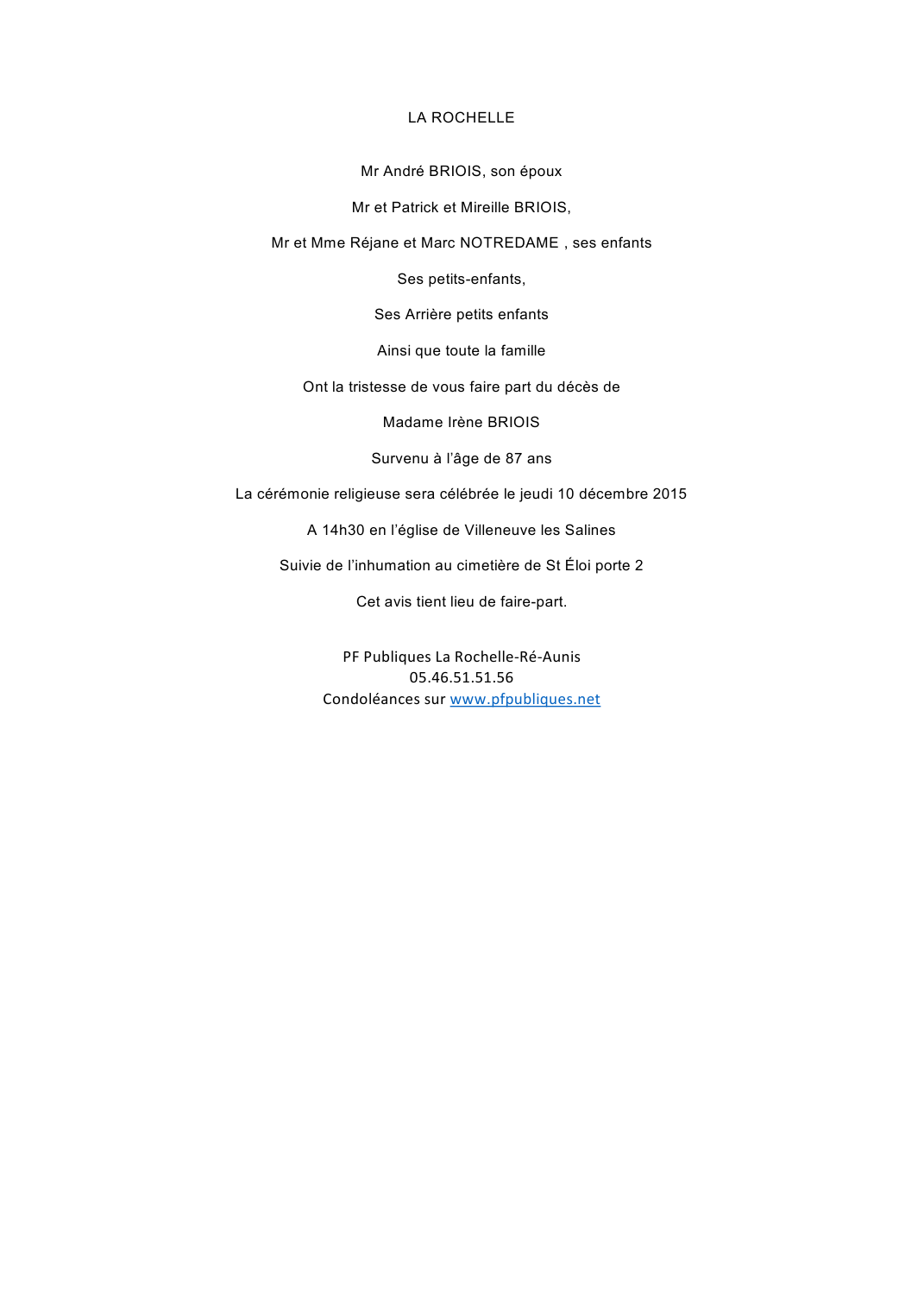 Décédée à La Rochelle (17000, France) le lundi 7 décembre 2015 à l'âge de 87 ans