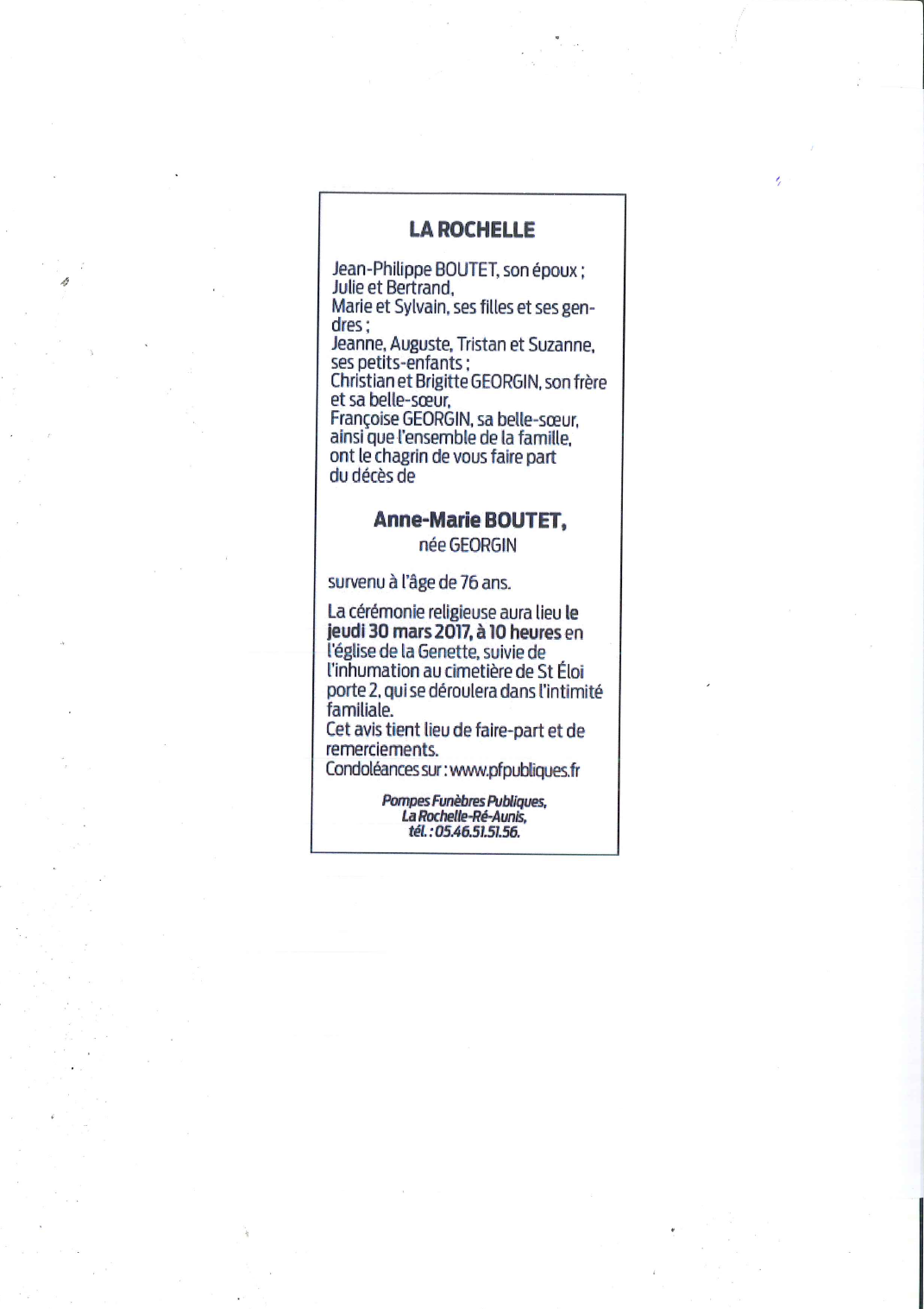 Décédée à La Rochelle (17000, France) le lundi 27 mars 2017 à l'âge de 76 ans