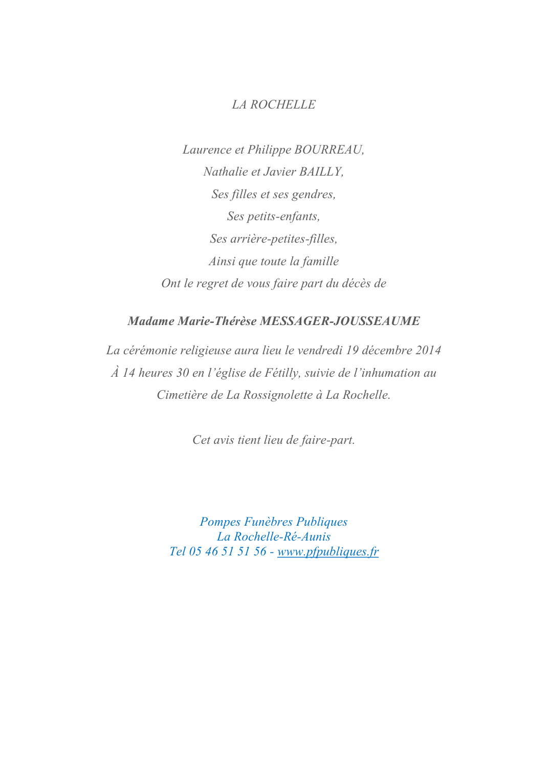 Décédée à La Rochelle (17000, France) le mercredi 10 décembre 2014 à l'âge de 84 ans