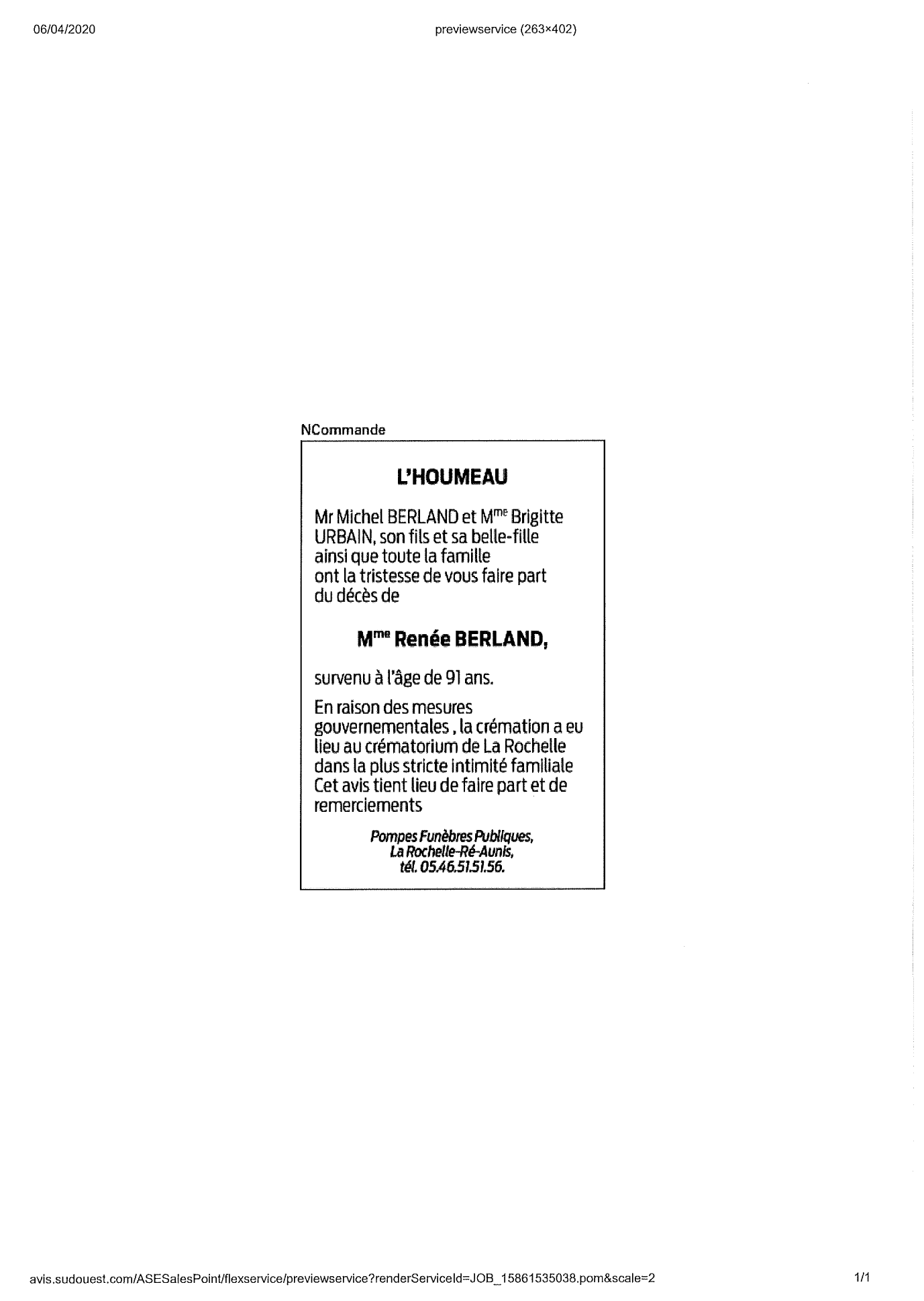 Décédée à La Rochelle (17000, France) le vendredi 3 avril 2020 à l'âge de 91 ans