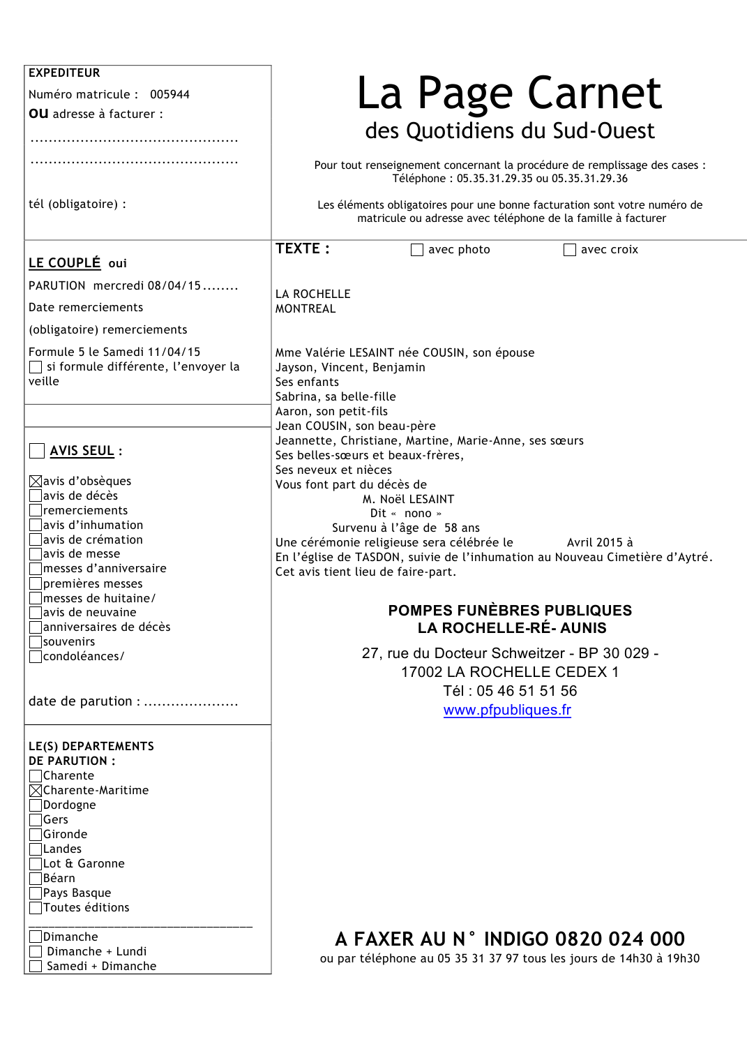 Décédé à La Rochelle (17000, France) le lundi 6 avril 2015 à l'âge de 58 ans
