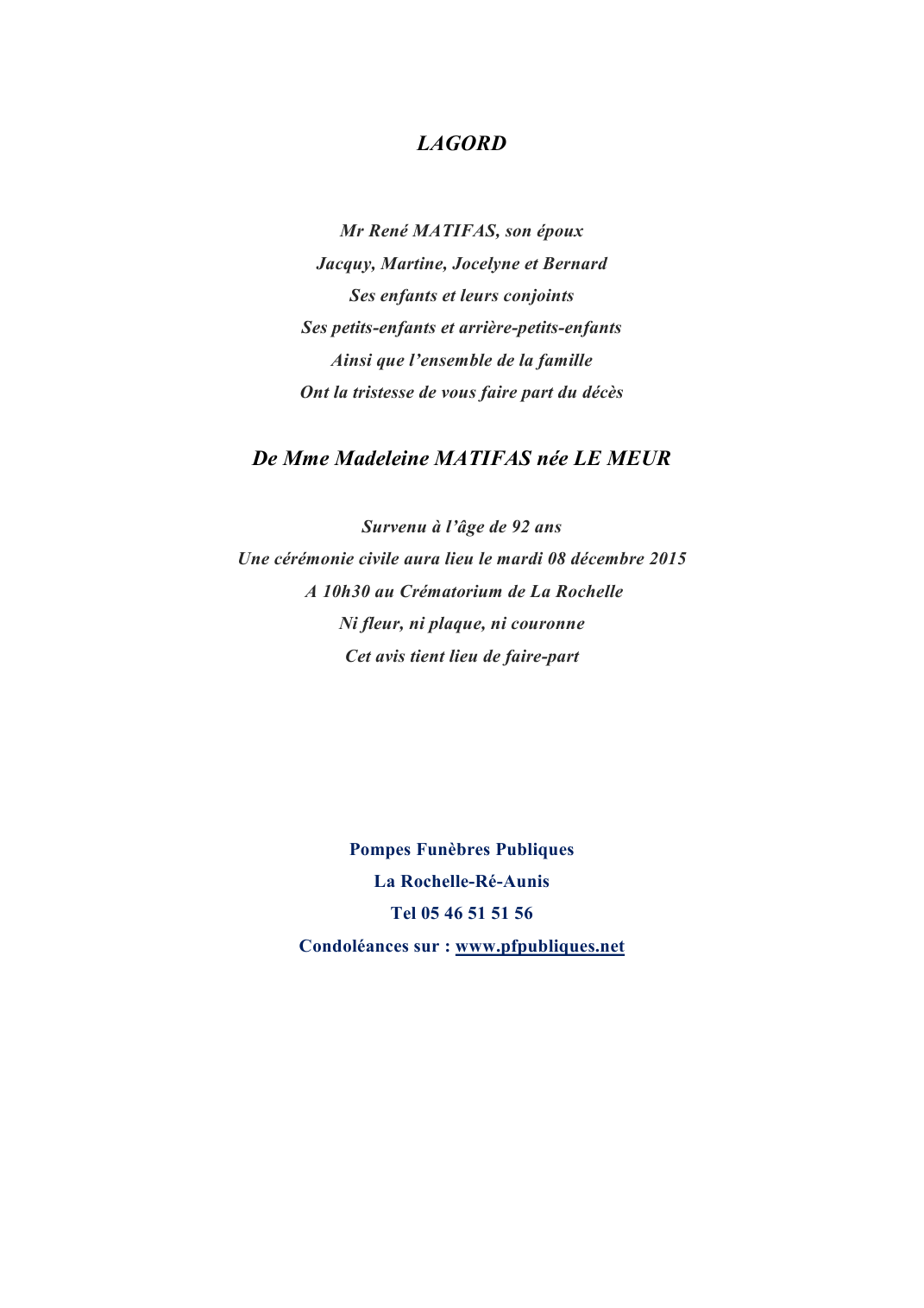 Décédée à La Rochelle (17000, France) le mercredi 2 décembre 2015 à l'âge de 92 ans