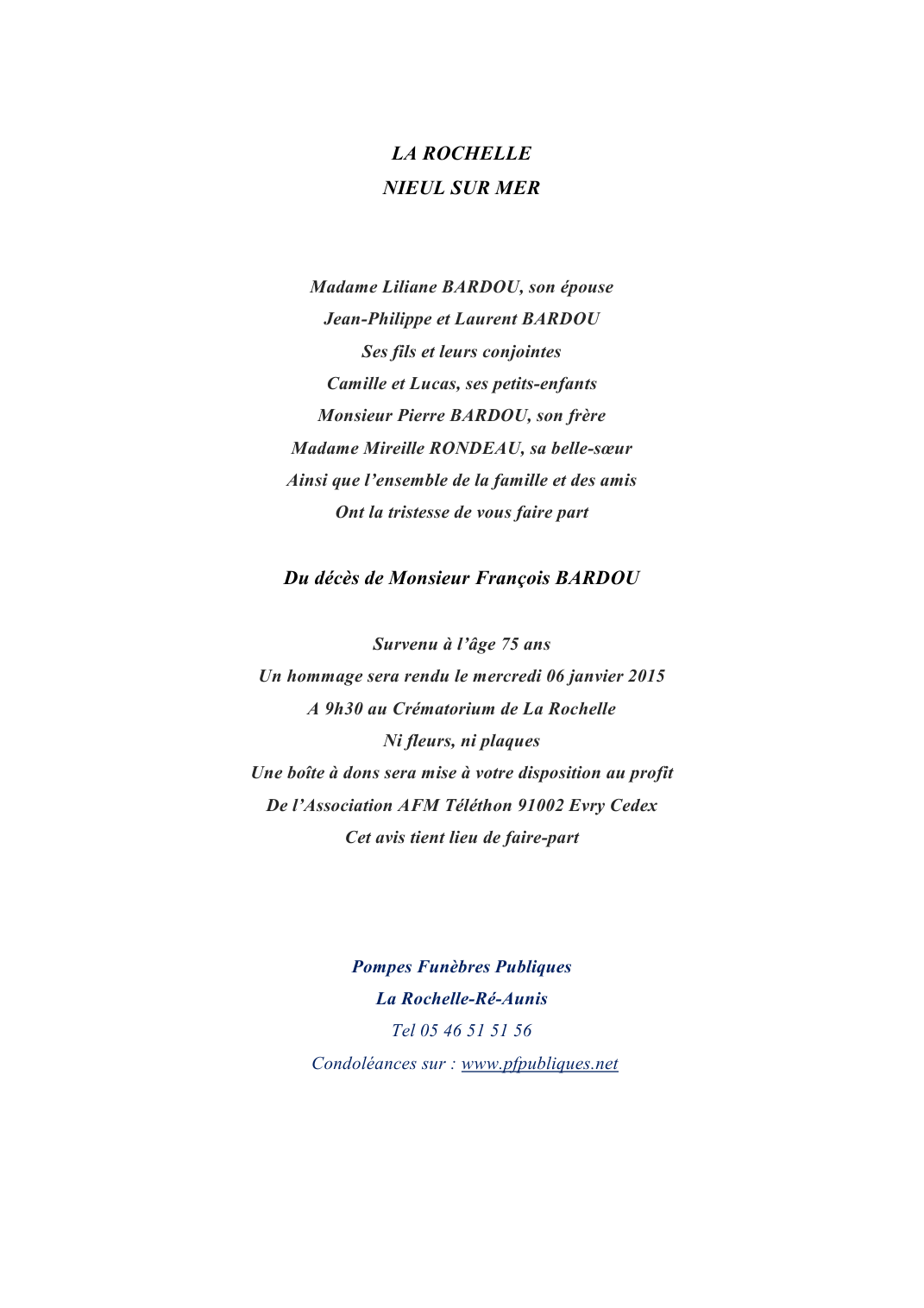 Décédé à La Rochelle (17000, France) le lundi 28 décembre 2015 à l'âge de 75 ans