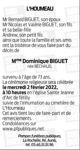 Décédée à Poitiers (86000, France) le lundi 24 janvier 2022 à l'âge de 73 ans
