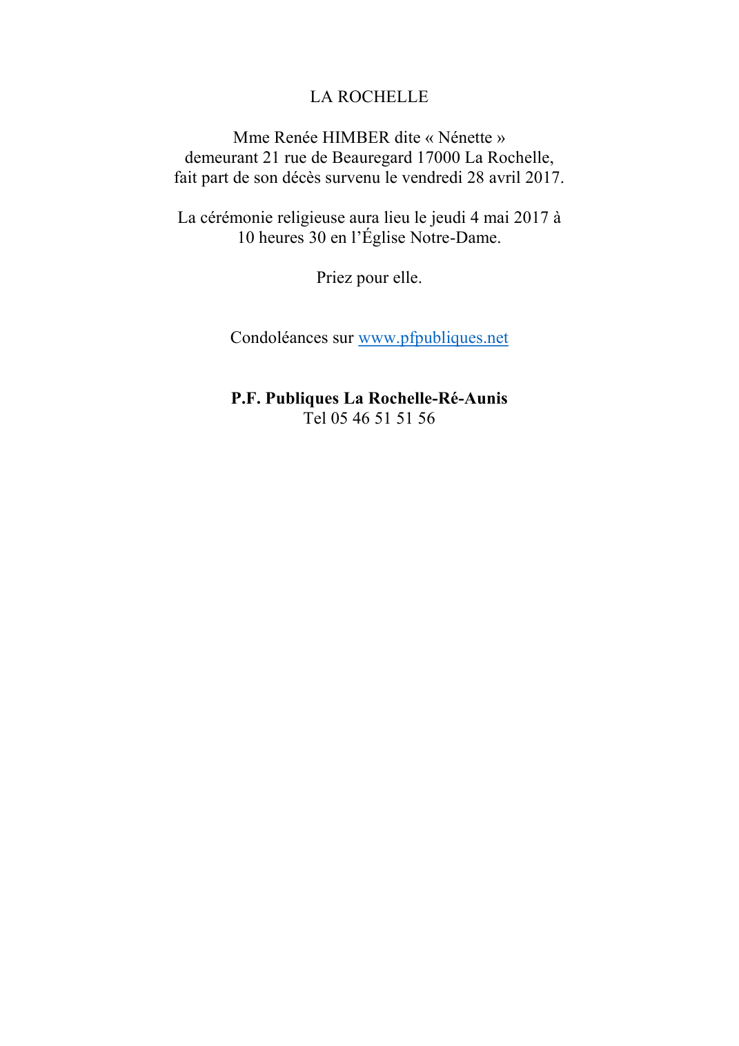 Décédée à La Rochelle (17000, France) le vendredi 28 avril 2017 à l'âge de 99 ans