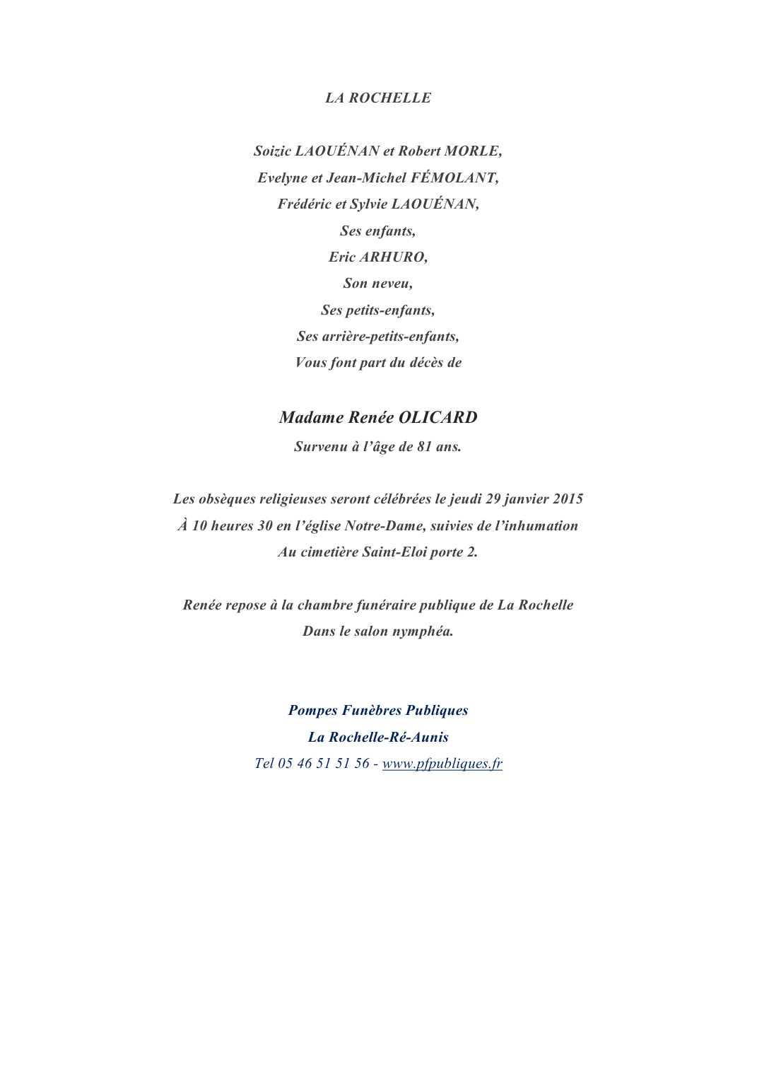 Décédée à La Rochelle (17000, France) le dimanche 25 janvier 2015 à l'âge de 81 ans