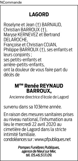 Décédée à Lagord (17140, France) le lundi 20 avril 2020 à l'âge de 102 ans