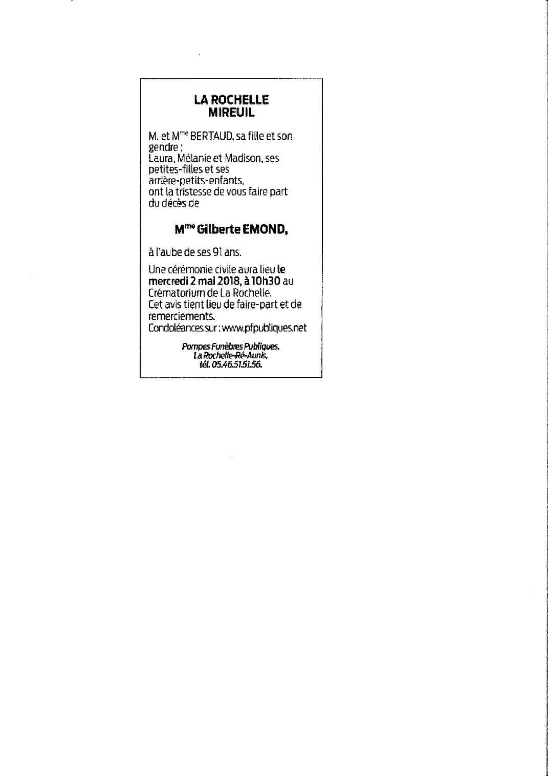 Décédée à Puilboreau (17138, France) le mercredi 25 avril 2018 à l'âge de 90 ans