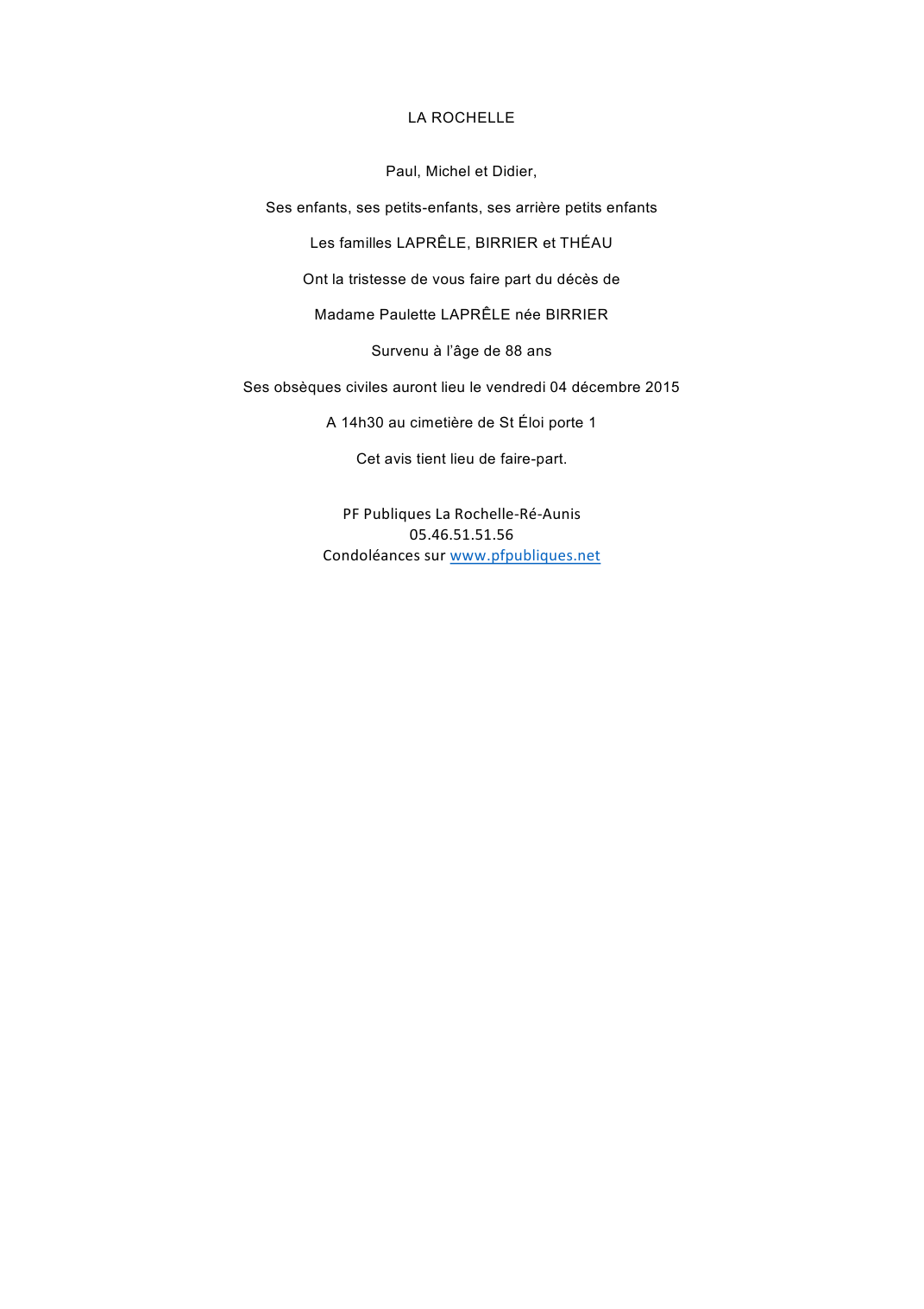 Décédée à Lagord (17140, France) le lundi 30 novembre 2015 à l'âge de 88 ans