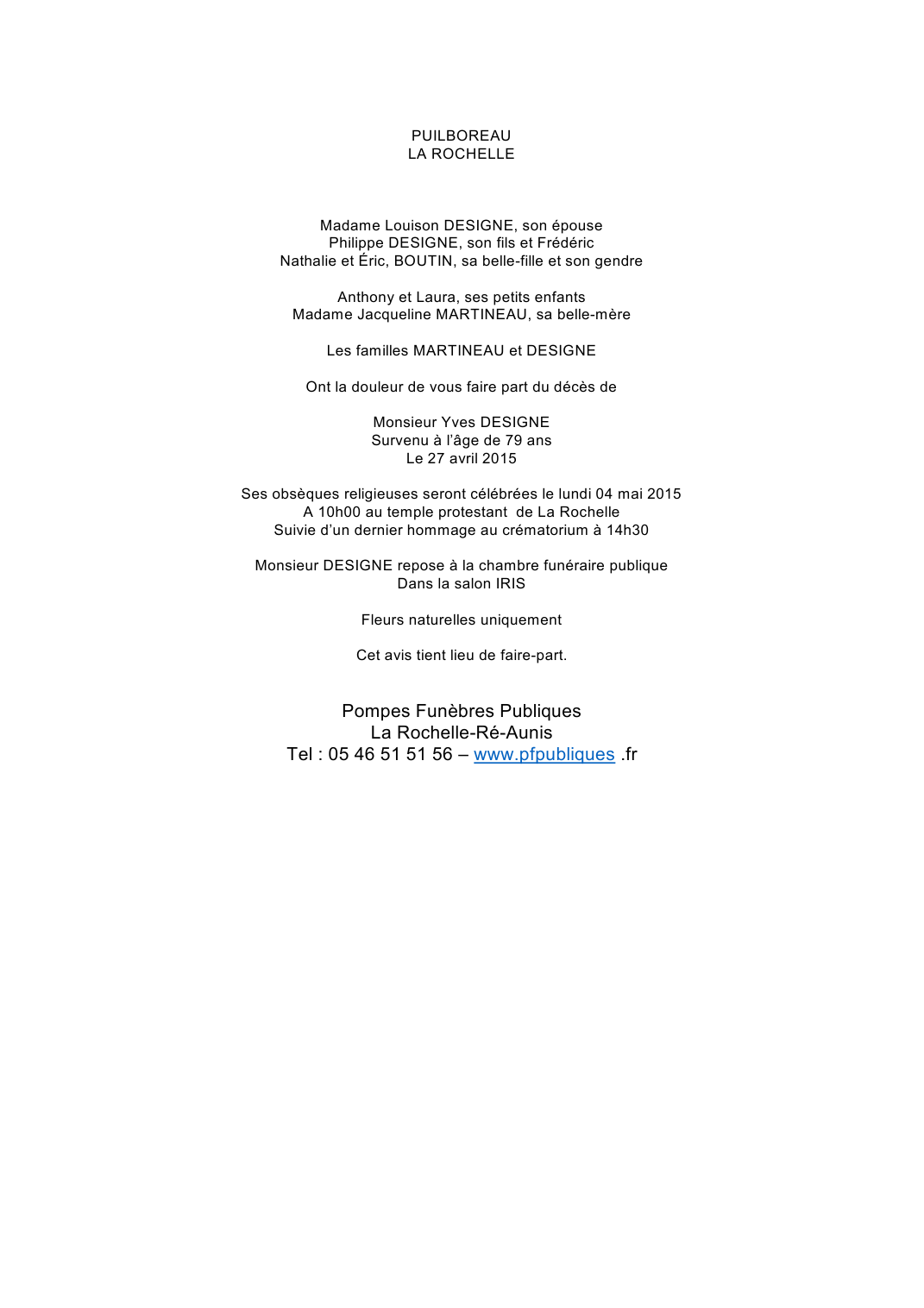 Décédé à Puilboreau (17138, France) le lundi 27 avril 2015 à l'âge de 79 ans