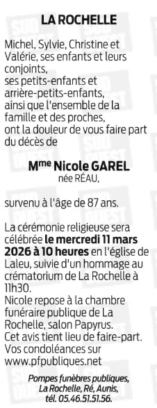 Décédée à Puilboreau (17138, France) le lundi 2 mars 2026 à l'âge de 87 ans