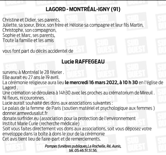 Décédée à Montréal (32250, France) le lundi 28 février 2022 à l'âge de 26 ans