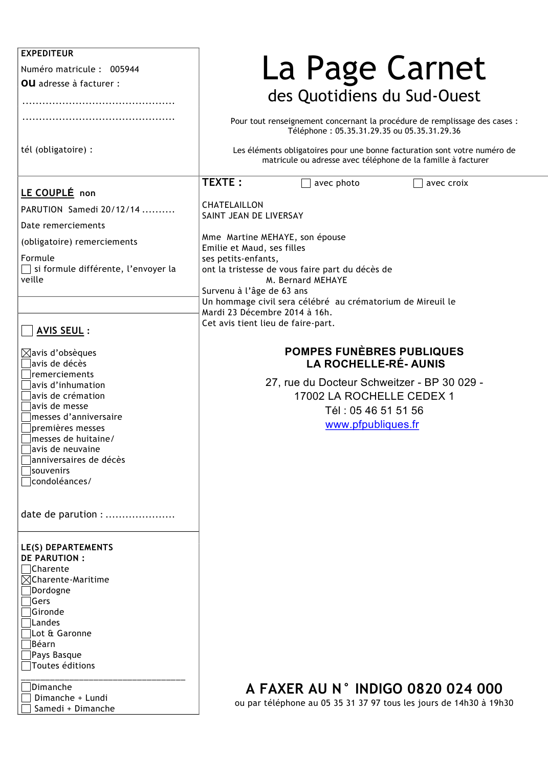 Décédé à La Rochelle (17000, France) le vendredi 19 décembre 2014 à l'âge de 63 ans